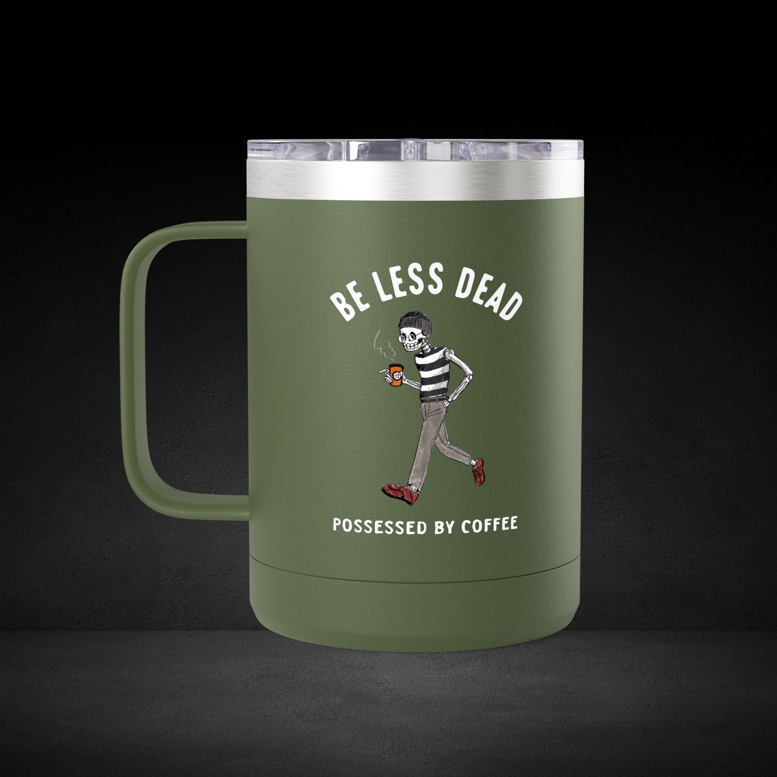 Skeleton Stroll Coffee Mug – Cool Walking Skeleton with Steaming Cup – Possessed by Coffee Travel Mug