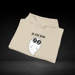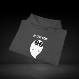 Channel your inner zombie with this hilarious “Be Less Dead” ghost hoodie featuring lightning bolt eyes that perfectly capture that pre-coffee mood. This relatable design speaks to everyone who feels like a ghost until their first cup of caffeine kicks in. Perfect for coffee addicts, night shift workers, and anyone who needs their morning brew to feel alive. Cozy sweatshirt with minimalist ghost art and dark humor that coffee lovers will appreciate. Great conversation starter!